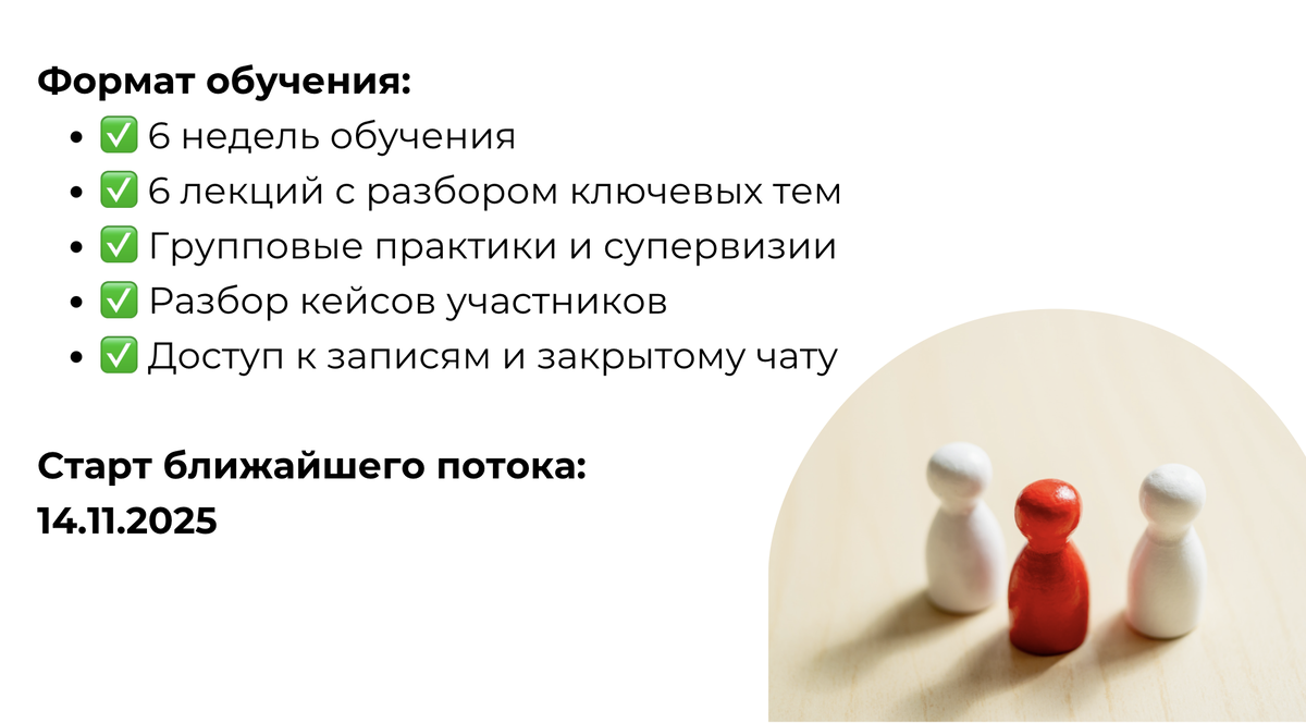 Программа сочетает теорию, живую практику и глубокую работу с личными темами, чтобы вы не просто изучили метод, а начали применять его в жизни и профессии.